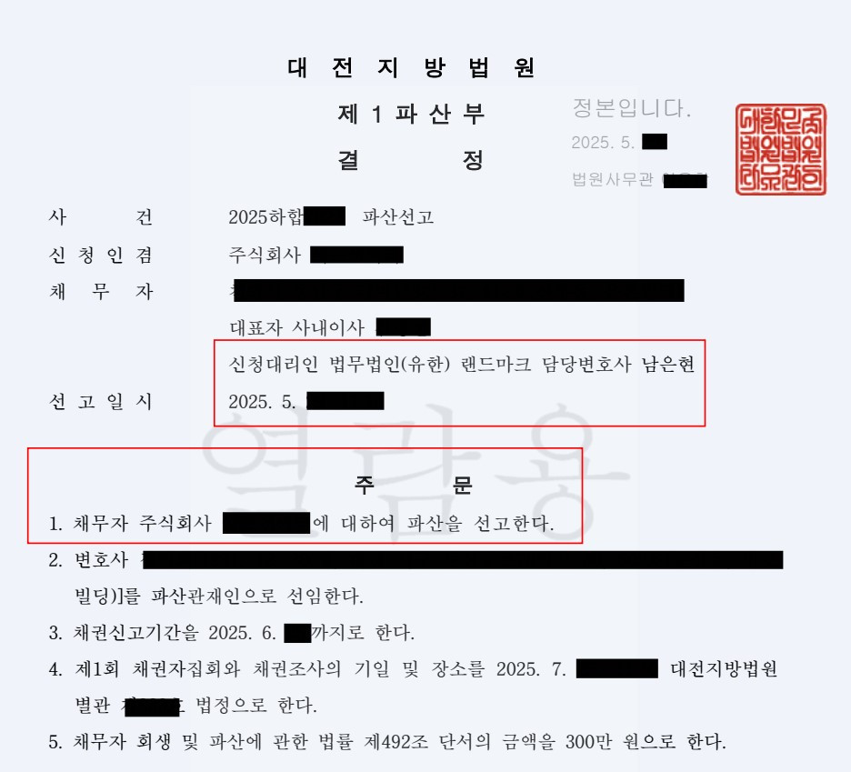 오늘은 최근 대전지방법원에서 선고된 무역회사 법인파산 사건을 소개드리고자 합니다. 실제로 회생법원에서 동일하게 신청한 사건들은 이미 파산 선고가 나고 관계인 집회까지 예정되어 있는데요. 대전지방법원 법인파산 사건의 경우 이제야 법인파산 선고가 내려졌습니다. 지방법원은 처리 속도가 확연히 느린 편이긴 한 것 같습니다.