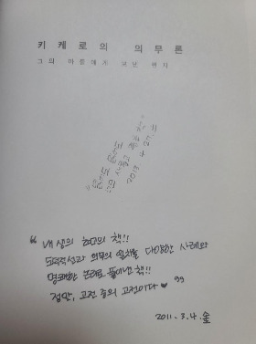 키케로의 <의무론>을 읽으면서, (라틴어 원전을 직접 번역하신 작가님께는 죄송하지만) 문장이 매끄럽지 못하다는 느낌을 종종 받았다. 그래도, 책을 읽어나가기엔 큰 어려움은 없었던 것으로 기억한다. 키케로가 아들에게 보내는 편지 형식이라 전체적 맥락 속에서 책을 읽어야 그 의미가 더욱 와닿기에 발췌할 수 있는 문장이 많지 않아 아쉬웠다. 과거의 내가 책 표지에 위 사진처럼 극찬을 적어 놓았는데, 사실 내가 이 책을 두 번이나 완독 했다는 것이 신기할 정도로 내용이 기억이 나질 않는다. 그래도 밑줄 그은 책과 감탄했던 메모가 남아있으니, 나의 어딘가에 책 내용이 있을 것이라 굳게 믿...믿..는다. 키케로의 <최고 선악론>은 다소 내용이 어려웠고, <노년에 관하여>는 비교적 수월하게 읽혔던 것으로 기억한다.