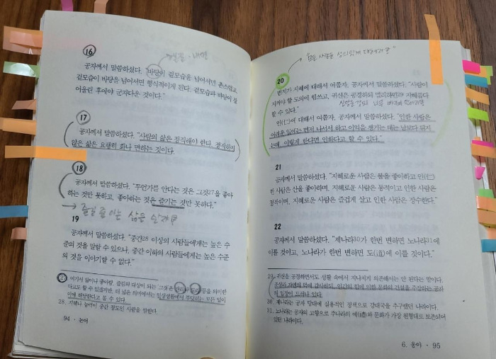 대학시절 명로진 작가님이 신촌에 위치한 심산스쿨에서 <고전강독반>을 개설하셨었다. 그때, 격주에 한 번씩 주말에 고전을 읽고 모여서 토론을 했었는데, <논어>는 그 당시 읽었던 책이다. <고전 강독반>은 대부분 나보다 20살 이상 많으신 분들이 수강하셨는데 , 그 분들 사이에서 주말 아침에 졸린 눈을 비비면서 열심히 책을 읽었던 기억이 난다.