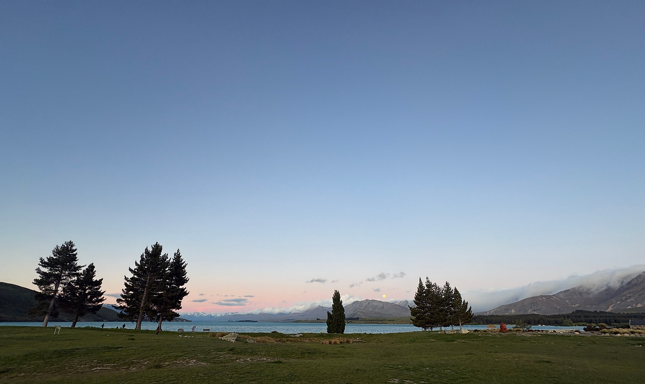 해외여행을 할 땐 운이 따르는 편이다. 반대로 국내 여행을 할 때는 온갖 자연재해를 몰고 다닌다. (태풍, 봄에 겨울 날씨 되기, 폭풍우 등등) 크라이스트 처치에서 날씨가 별로 안 좋아서, 날씨 운은 이제 다했나라는 생각을 했다. 가장 기대한 여행지인 레이크 테카포 일기 예보도 계속 비, 흐림. 테카포로 향하는 버스에서 바라본 하늘도 잔뜩 흐렸다. 좀 우울했다. 그런데 도착하자마자 파란 하늘이 보이기 시작하더니, 저녁엔 아름다운 노을과 둥근달까지.