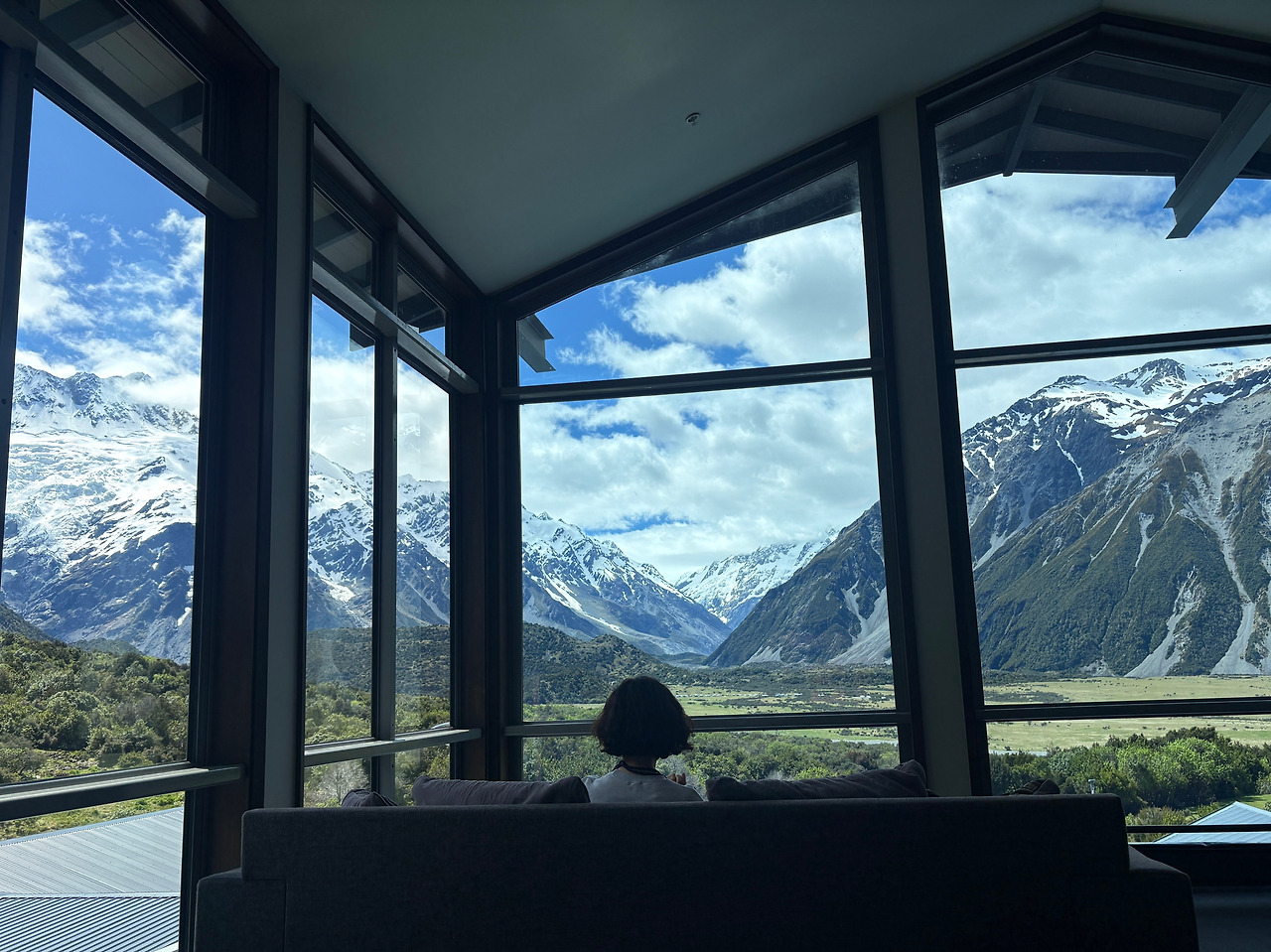 마운트쿡으로 트래킹을 떠나는 아침에도 날씨가 춥고 (11월에 눈이 내렸다. 뉴질랜드의 11월은 한국의 5월) 잔뜩 흐렸다. 그런데 마운트쿡에 도착하자마자 파란 하늘이 보이더니, 흰 구름과 어울려 장관과 마주했다.