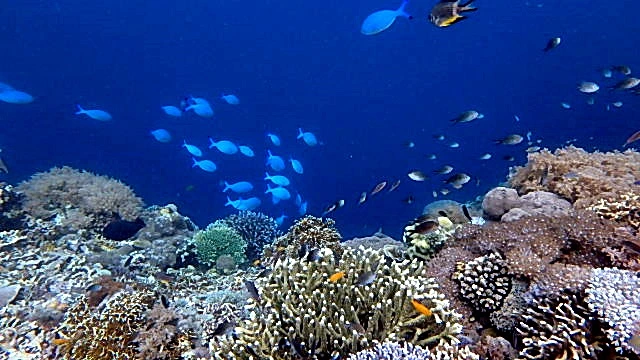 바닷속으로 들어갈수록 붉은색부터 사라지기 때문에 물속이 깊이 들어가면 들어갈수록 주변이 더욱 파랗게 보인다.