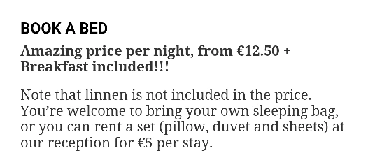 도미토리 요금에 시트 사용료는 포함되어 있지 않으니 개인 침낭을 가지고 가거나 5유로를 더 내고 빌려야 한다. 주로 저렴한 숙소에서 묵었던 나는 항상 침낭을 가지고 다녔다. 종종 시트가 무료인 곳도 있었지만 배드 버그 등이 걱정돼서 시트 위에서도 꼭 침낭을 깔고 잤다.