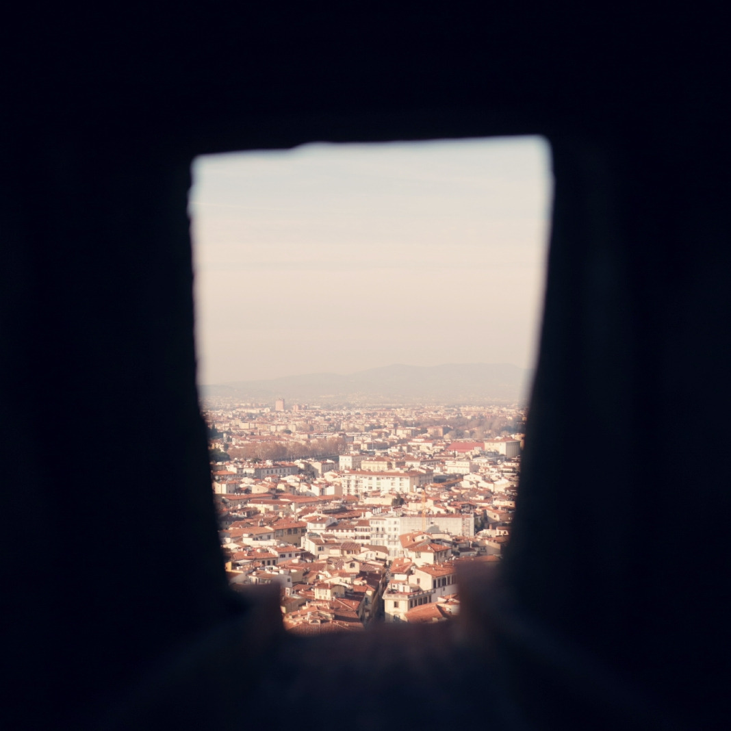 두오모에서 계단을 따라 내려오는 중간중간 벽에 창문이 나 있다. 손바닥 만한 그 작은 창으로 들어오는 햇살이 건물 내부를 밝히는 유일한 조명이다. 작은 창을 통해 바라보는 피렌체 시내의 모습이 멋스럽다. 현재의 세상에서 과거의 세상을 내려다보는 것 같다.