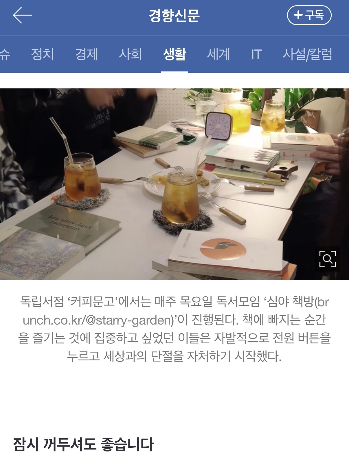 브런치에서 독서모임에 대해 꾸준히 글을 쓴 Starry Gerden 작가님 덕분에 우리의 독서모임이 경향신문에 소개되었다. 우린 그저 책을 읽고 이야기는 나누었을 뿐인데 기사까지 난다는 것에 얼떨떨하고 쑥스럽기도 했다. 하지만 더 놀라운 일이 벌어졌다.