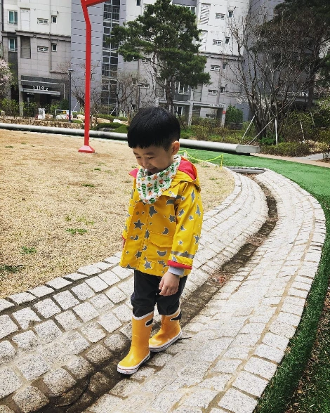 아들은 아무렇지 않게 물 웅덩이를 밟고 지나간다.
