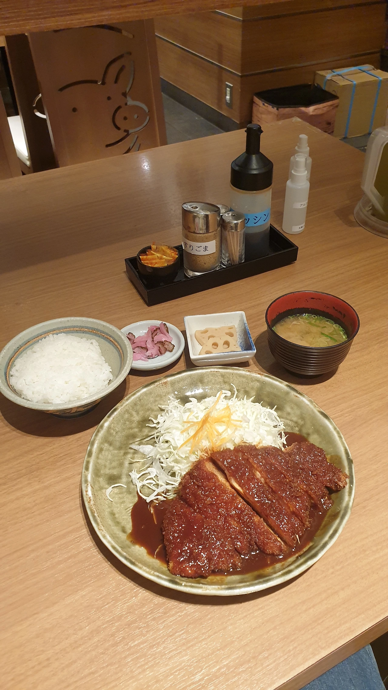 돈가스 위에 직원이 소스를 직접 부어주었다. 따끈따끈한 데미그라스 소스의 향이 참 좋았다. 소스의 색이 불그스름했는데 아무래도 이 식당의 특제소스인 것 같았다. 돈가스를 먹는 동안 알아들을 수 없는 일본어가 옆에서 계속 왱왱 들렸다.