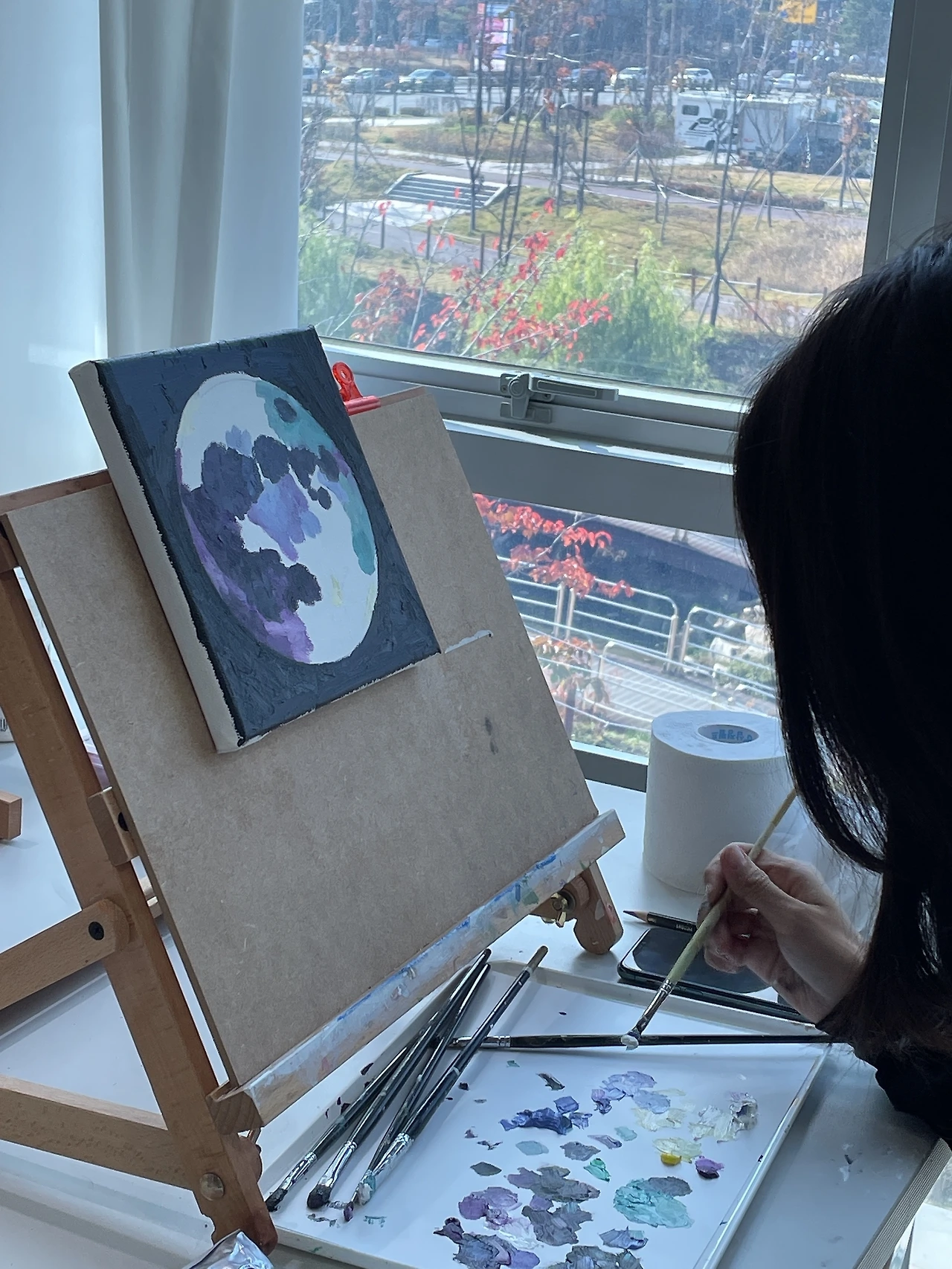 유화 물감은 덩어리가 커서 아무래도 날렵한 표현은 어렵더라고요. 아직 서툴러서 그럴 수도 있지만요. 아무튼 배경과 달의 색이 섞이지 않도록 조심조심 그린다고 그렸는데도 테두리가 울퉁불퉁해졌습니다. 그랬더니 오히려 더 편안하고 몽글몽글한 달이 태어났어요. 어울리는 동화책이 있다면 삽화로 넣고 싶은 달님입니다.