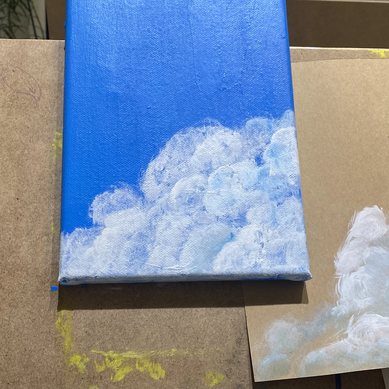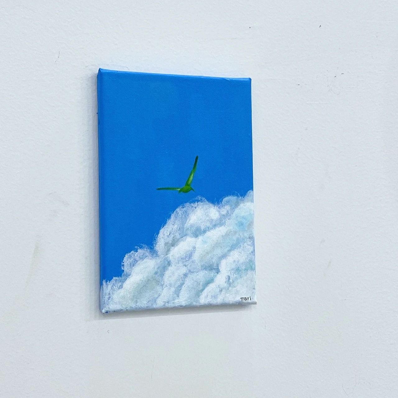 당신의 세상에는 당신만의 울타리가 있습니다. 워낙 단단해 보여서 초대받지 않은 사람이라면 당신의 세상이 이렇게 신나는 곳이라고는 전혀 상상도 못 할 거예요. 그 울타리 안의 즐거움을 포근하고 환상적인 구름에 담았습니다. 구름이 더 푹신하고 뭉글해 보이기 위해서는 가장자리 표현이 중요합니다. 그런데 아이러니하게도 그런 표현을 위해 오히려 물기 없이 건조한 붓을 사용해야 하더군요. 뻑뻑한 붓에서 부들함이 나오다니. 당신이 담백하게 툭툭 던져주시는 애정의 몽글함이 떠올랐습니다.