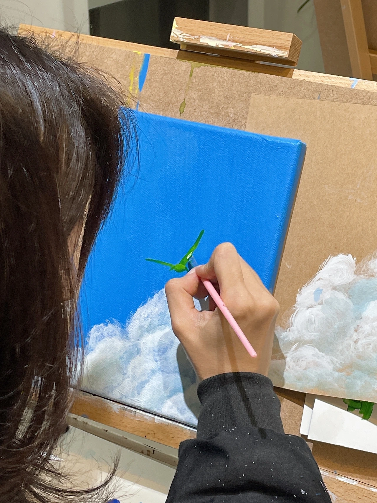확실하고 뚜렷한 당신은 빠르게 마르는 선명한 아크릴 물감을 닮았습니다. 아크릴은 순식간에 말라서 물감이 서로 섞이거나 뭉개지지 않습니다. 실수로 잘못 그렸더라도 다른 색으로 깔끔히 덮을 수 있지요. 이 날도 원래는 푸른 하늘 아래 나무 한그루를 그리고 있었어요. 그런데 생각할수록 가만한 나무보다는 자유로운 새가 당신에게 더 어울렸습니다. 그래서 파란색 물감으로 그렸던 나무를 덮고 새로운 하늘을 만들었어요. 쿨하고 뒤끝 없는 당신과 닮은 점이 참 많은 재료입니다.