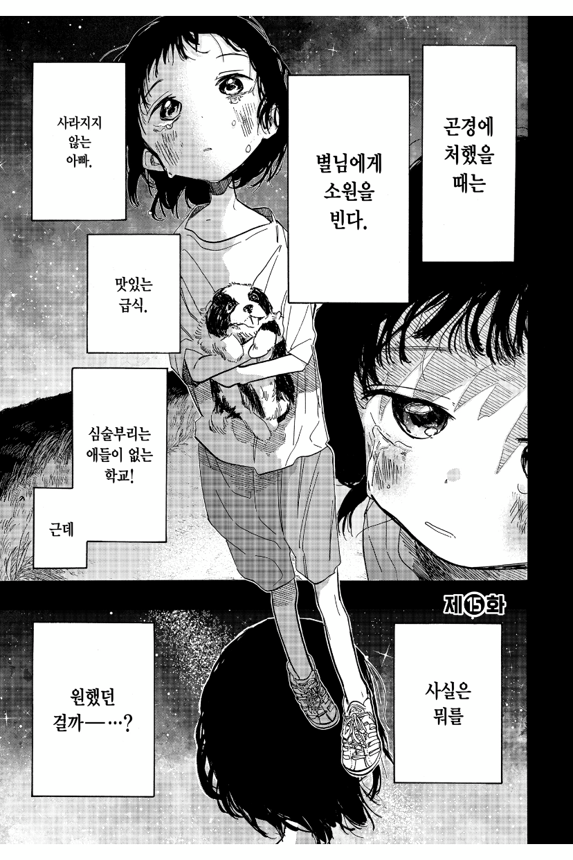 위의 문장은 작가 Taizan5가 만화가 시작되기 전 작가의 말에서 쓴 글이다. <타코피의 원죄>는 독자들에게 힘들거나 절망적이었던 경험이 있었는지 묻는다. 그 때 느꼈던 감정은? 그 상황에서 원하는 것은? <타코피의 원죄>는 이러한 질문과 답을 위해 '시즈카'와 '마리나'를 등장시킨다. 둘을 등장시킴으로써 자연스레 우리에게 질문하고, 자연스레 답이 나오도록 이야기를 풀어낸다. 나는 <타코피의 원죄>에서 이야기를 풀어가는 방식과 극적으로 만들고자 하는 장치들이 굉장히 마음에 들었다. 그래서 이렇게 리뷰 글을 쓰기로 마음 먹었다.