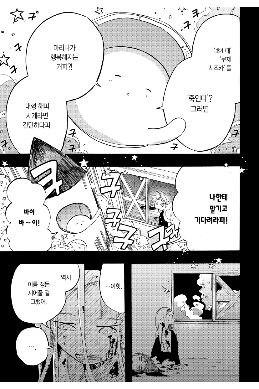 이외에도 <타코피의 원죄>는 위와 비슷한 연출을 계속해서 보여준다. 같은 구성이지만 내용은 정반대로 제시하여 계속해서 극적인 효과를 준다. 나는 이러한 만화 연출을 <타코피의 원죄>에서 처음 보았다. 더 이상 만화는 애니메이션의 하위호환이라고 생각하지 않게 되었다. 오히려 만화에서만 줄 수 있는 긴장감과 속도감이 나를 더욱 몰입시켰던 것 같다.
