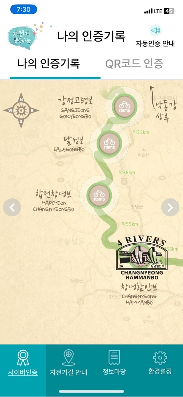 그렇게 7월 28일(금) 저녁 6시 15분 마리오를 태운 자전거는 마산 가톨릭문화원에서 출발했다. 창녕함안보까지 24.5km. 해가 막 떨어지고 창녕함안보에 도착한 나는 다시 한숨 돌리자마자 (진주, 의령, 대구를 연결하는 적포교) '적교 삼거리'까지 약 45km를 낙동강 줄기 따라 달렸다.