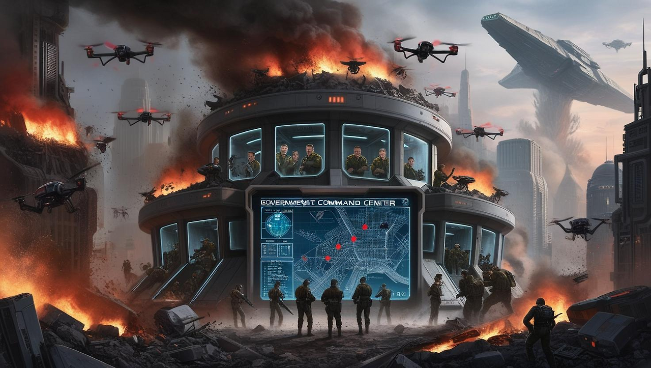 그 한가운데에 자리 잡은 정부군 지휘본부는 분주한 에너지가 가득했다. 두꺼운 방탄유리창 뒤에서, 지휘관들과 장교들이 쉼 없이 교전 보고를 주고받고 있었다. 덩치 큰 홀로그램 디스플레이에는 도시 전체가 정밀 지도 형태로 펼쳐져 있었고, 아르고스(ARGOS) 감시 시스템이 추적 중인 표적 좌표가 빨간 점으로 군데군데 번쩍였다.
