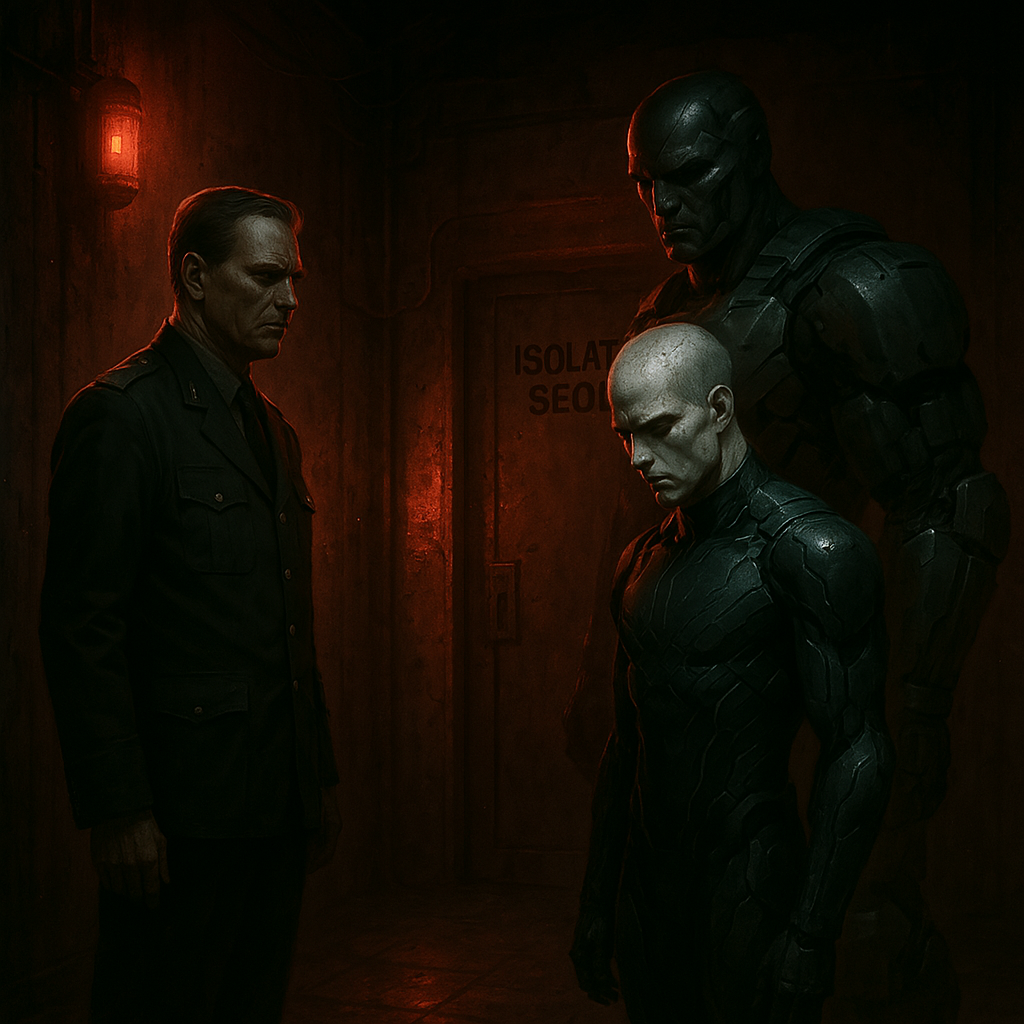 배스토니 교정시설 지하 격리 구역에는 이상할 정도로 무겁고 습한 공기가 감돌았다. 이곳을 전담하는 소장 프레이저(Frasier)가 계단을 타고 내려오자, 간간이 빛나는 적색 조명등이 그의 군복 어깨 위로 흘러내렸다. 철제문을 열고 들어간 방에는, 제로(Zero)와 오리온(Orion)이 나란히 서 있었다.