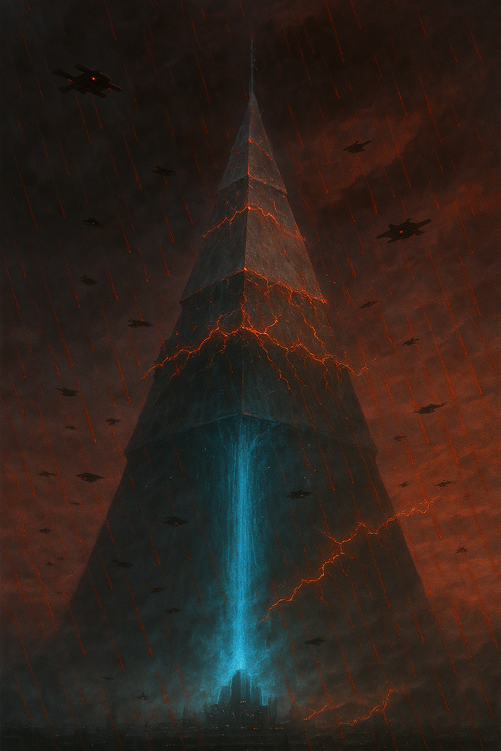 도시 중심부에서 멀리, 블루 펜타곤은 은빛 장막을 펼쳐 보이고 있었다. 탑의 하단부가 파랗게 빛나는 연기 기둥을 뿜어내며, 주변 공간을 에워싼 드론들이 일사불란하게 비행 중이었다. 짙은 구름 사이로 내리는 붉은 산성비가 탑 외벽을 타고 흐를 때마다, 기괴한 전기 스파크가 반짝이며 주변을 잠식했다.