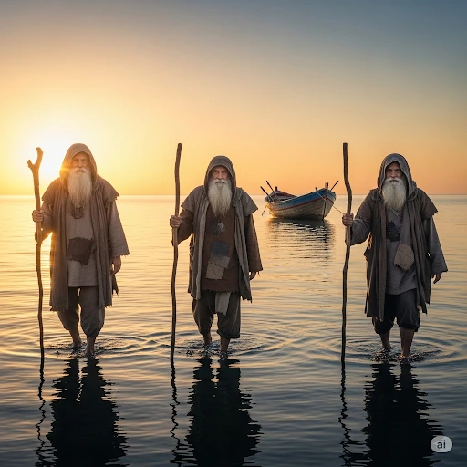 하지만 주교님이 배를 타고 돌아가는 길에 놀라운 일이 벌어졌습니다. 주교님이 탄 배가 바다 한가운데를 지날 무렵, 멀리서 세 개의 빛나는 형체가 바다 위를 걸어오고 있었습니다. 그들은 바로 세 명의 은수자들이었습니다! 그들은 주교님을 붙잡고 가르쳐준 기도를 잊어버렸다고, 다시 가르쳐달라고 간청했습니다. 주교님은 그들의 순수함과 하느님께 대한 지극한 사랑에 깊이 감동하여 말했습니다. "여러분, 여러분의 기도는 저의 기도보다 훨씬 더 하느님 마음에 드는 기도입니다. 부디 여러분이 하시던 대로 하느님께 기도하십시오!"