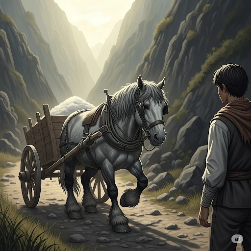 하지만 사람들은 그의 빠른 다리와 깊은 숨결을 알아보지 못했습니다. 무거운 소금 수레는 그의 등을 짓눌렀고, 날개 같던 다리는 어느새 상처투성이가 되었습니다. 비탈길을 오를 때마다 말굽은 돌에 부서지고, 힘겨운 숨소리는 산골짜기 바람에 스러지곤 했습니다.
