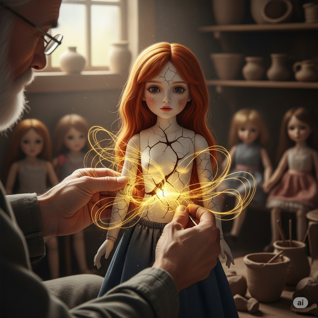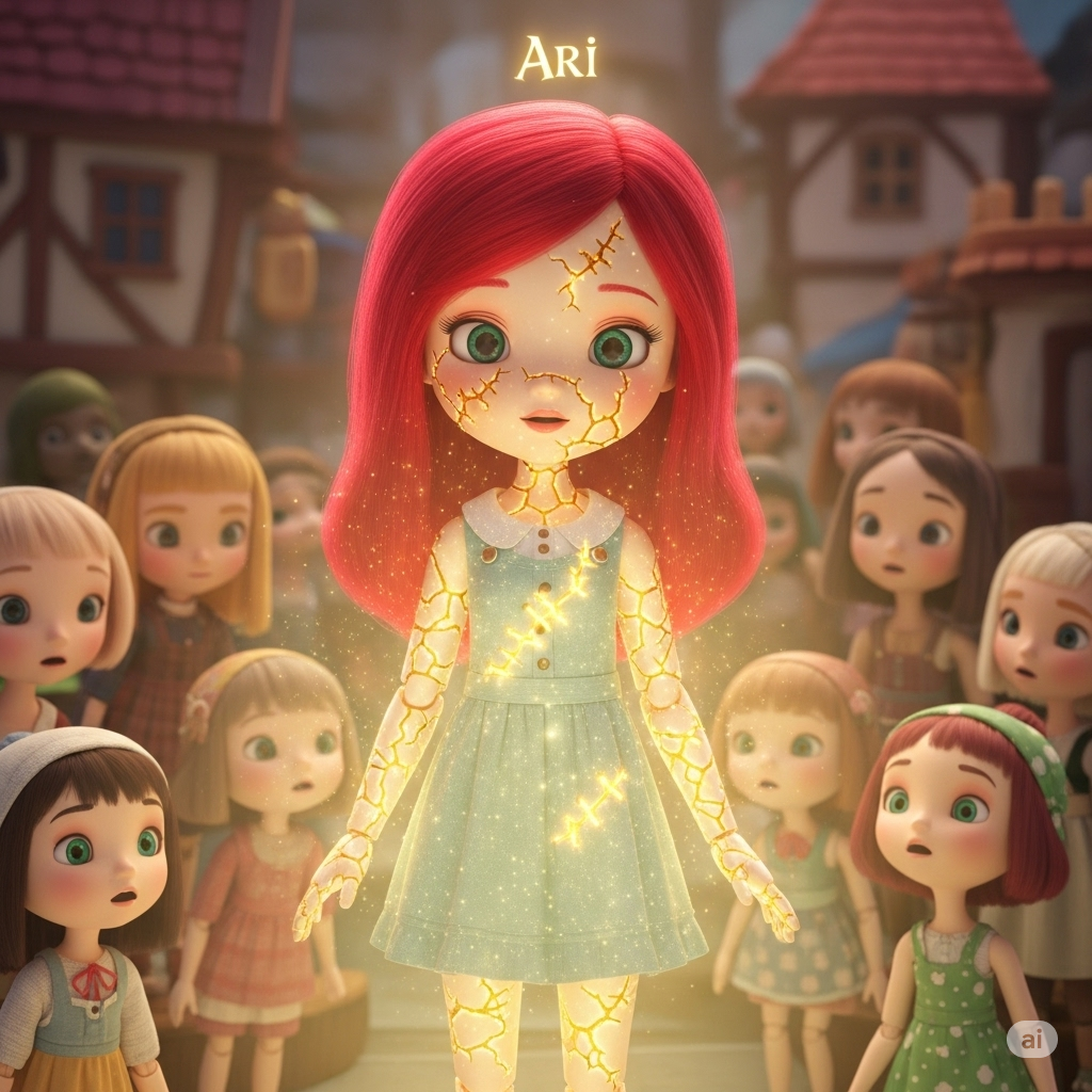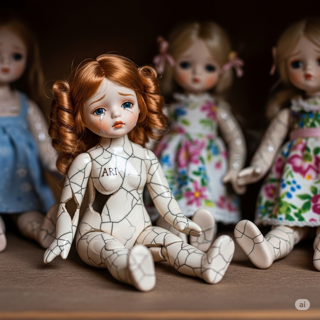 아리는 한때 마을에서 가장 반짝이고 고운 인형이었답니다. 하지만 실수로 높은 선반에서 떨어져 온몸에 금이 가고, 작은 팔 하나가 산산이 부서지고 말았어요.
