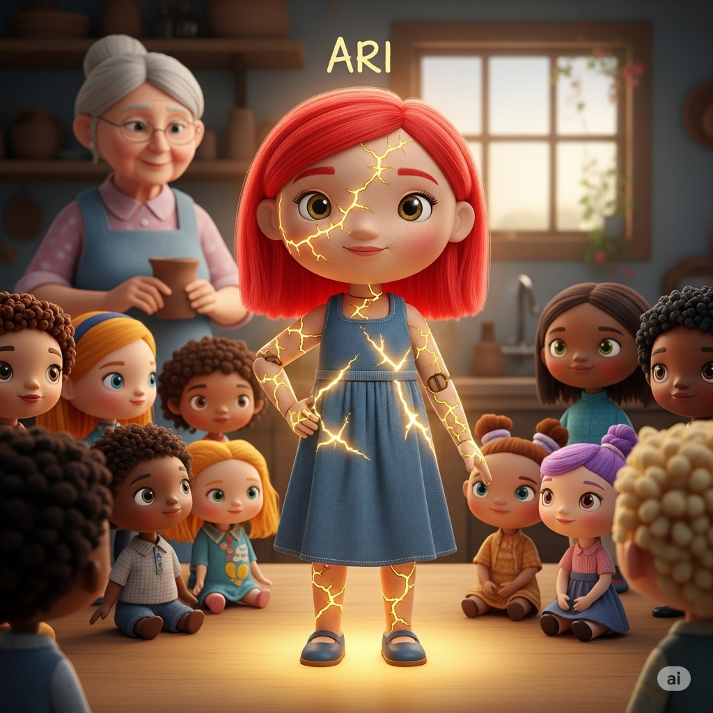 며칠 뒤, 아리는 반짝이는 금빛 무늬를 안고 다시 도자기 마을로 돌아왔어요. 아리를 본 다른 인형들은 눈을 동그랗게 떴어요.