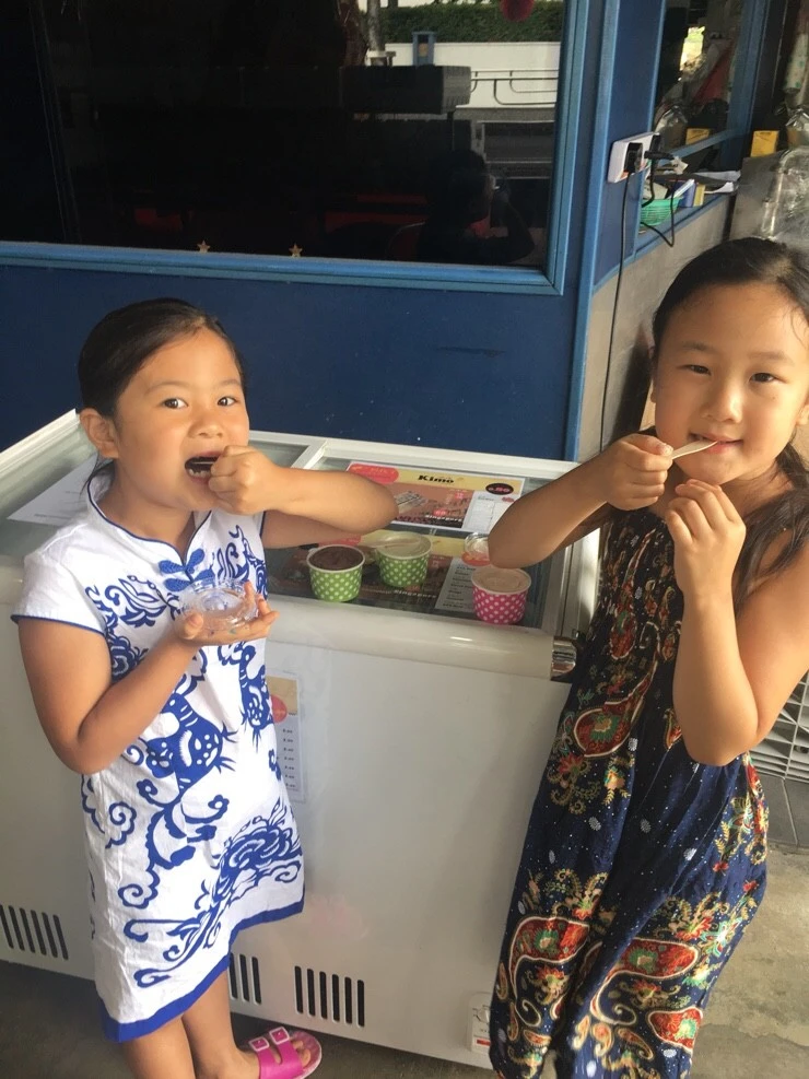 오늘도 아이스크림 가게가 보인다. 문을 열고 싶다. 어제 12시간 넘게 걸어 다녀서 그런가? 18일 만에 처음이다. 문을 열었다. 편안한 마음으로 아이스크림 가격과 맛을 물어봤다. 주인은 두리안 맛을 추천했다. 두리안 과일은 아직 못 먹는다고 했는데도 주인은 강력 추천한다. 주인의 추천대로 두리안 맛 아이스크림을 주문했다. 아이들은 망고와 초코 아이스크림을 주문했다.