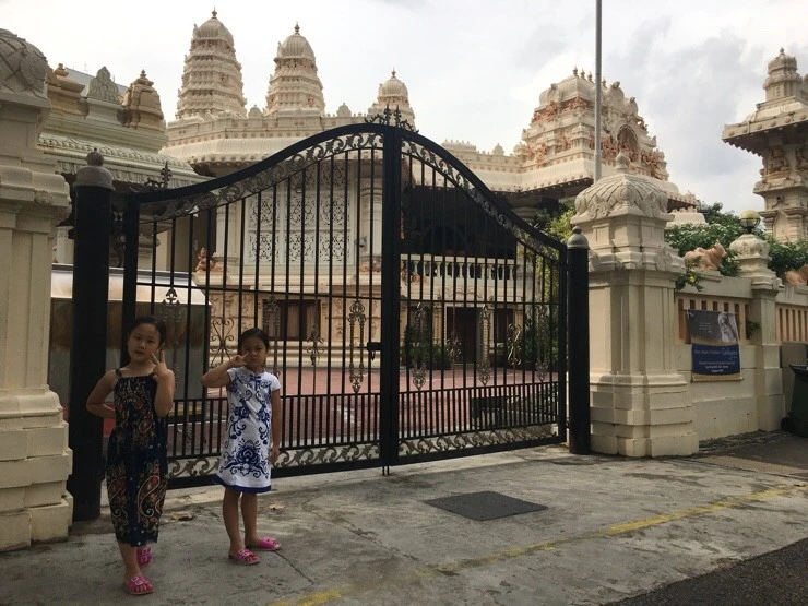 공원 바로 앞에 있는 수영장은 꽤 크다. 어린이 수영장은 공사 중인 것 같다. 아이들이 들아가고 싶어 한다. 수영복을 안 가져왔으니, 오늘은 이용 못하지만, 다음에라도 이용 가능한 지, 가격은 얼만지 알아보려고 기웃거려 봤다. 하지만 직원이 안 보인다. 지나가는 사람도 없다. 하는 수 없이 담벼락 너머로만 구경했다. 아이들, 많이 아쉬운지 쉽게 자리를 못 떠난다. 다음에 시간 될 때 다시 오기로 하고 지도에 보이는 힌두교 사원을 찾아갔다.