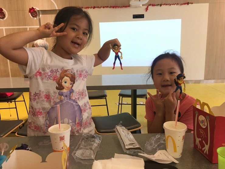 아예 점심을 먹고 놀려고 맥도날드에 들어왔다. 주문하고 자리 잡는 동안 아이들 둘은 나갔다 오더니, 밖에서 페이스 페인팅을 하고 있다고 한다. 짐이랑 자리 지켜야 하니 하고 싶으면 하고 오르고 했다. 둘은 잠시 서로를 보더니 “응”하고 나간다. 한 참이 지났는데, 아직 들어오지 않는 아이들이 궁금해 잠시 나가봤다.