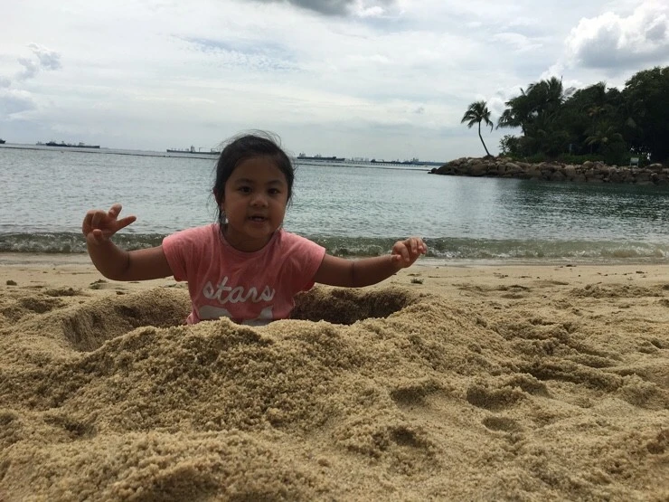놀다 보니 캄캄해졌다. 배도 고프고, 이제 슬슬 갈까 했는데, 너무나 아쉬워하는 표정이 마음에 걸려 아이들에게 “먹을 거 사 와서 여기서 더 놀까?”라고 물어보니 좋다며, 얼굴 표정이 더 밟아진다. 그리고 전에 여기 왔을 때 어두운 밤인데도, 사람들이 앉아서 센토사섬에서 나오는 빛이 비친 바다 풍경을 보며 앉아서 음식을 먹는 모습을 봤을 때 부러웠다며, 그렇게 해보고 싶었다는 말도 해준다.