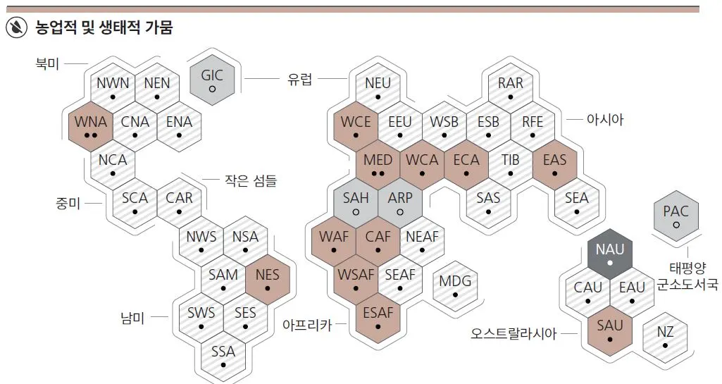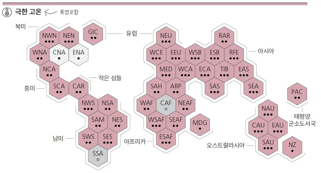 다음은 1950년대에 대한 지역별 극한 고온, 가뭄, 폭우 변화를 나타낸 그래프입니다. 색채가 진할 수록 '상승'했다는 뜻이고, 진한 회색은 '감소'를, 연한 회색은 '제한된 데이터/문헌', 줄무늬 회색은 '변화 유형의 (과학자들 간) 낮은 동의'를 나타냅니다.