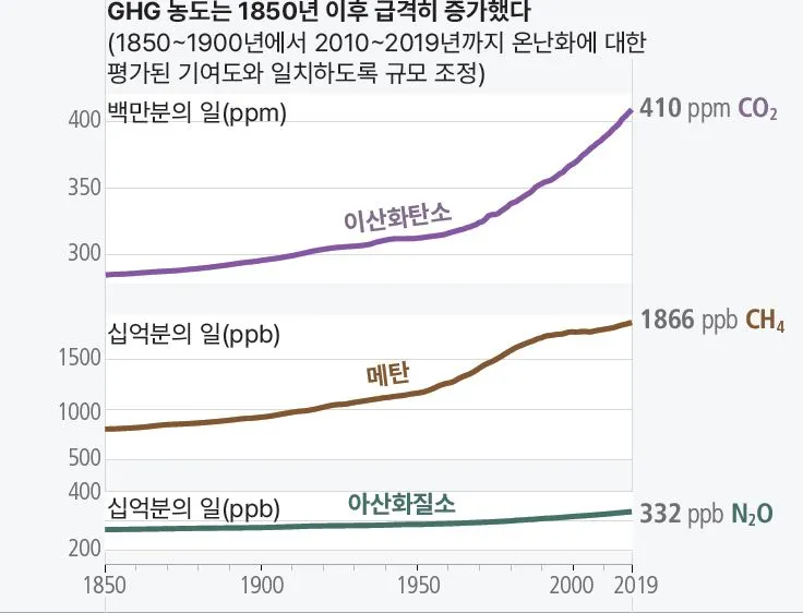 온실가스가 많이 배출된다는 것은 곧 대기 중 농도에도 영향을 끼친다는 뜻이죠! 농도의 단위('백만분의 일-ppm', '십억분의 일-ppb')는 다르지만 모두 증가함을 확인할 수 있습니다.