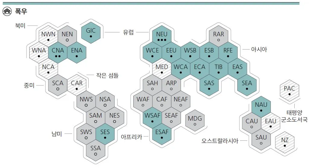 - 대부분의 육지 지역에서 호우 현상의 빈도와 강도 증가했다