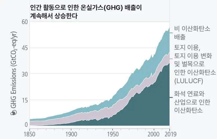 그래프에 적힌 것처럼 토지 이용, 벌목, 화석 연료와 산업 등의 활동으로 온실가스 배출량이 상승하게 된 것입니다. 이때 1850~1900년에서부터 시작하는 이유는 그 즈음부터 산업화가 시작했기 때문이에요.