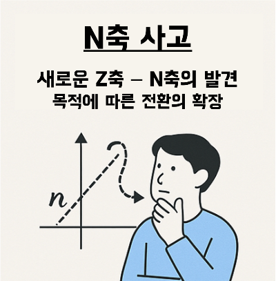 이 질문이 저를 ‘목적에 따라 z축을 새롭게 설정하는 사고’, 즉 n축 사고로 이끌었습니다. n축 사고는 그냥 ‘하나 더 보기’가 아닙니다. 기존 프레임에 없던 새로운 축을 ‘기획의 목적에 맞게’ 스스로 정의하는 사고법이에요.