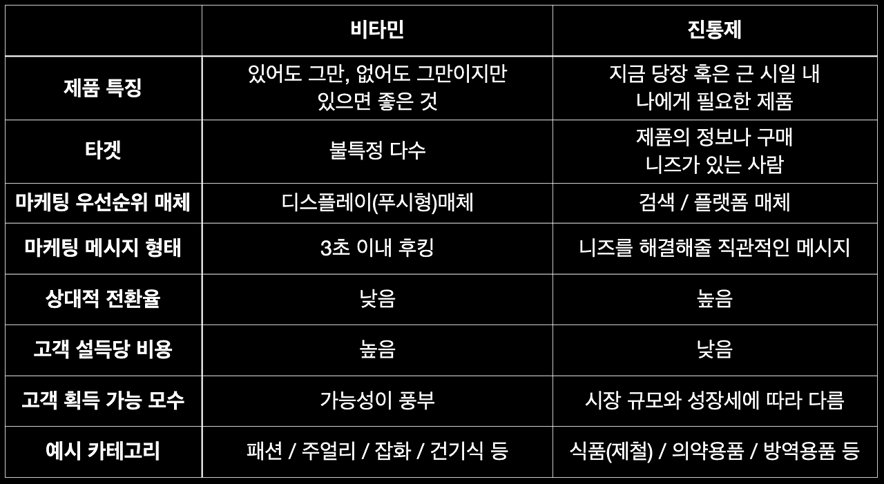 그래서 가장 먼저 내 브랜드 성향을 파악하기 위해 '비타민이냐 진통제냐'에 대한 고민이 모든 브랜드의 첫 고민이 되어야 한다고 생각한다.