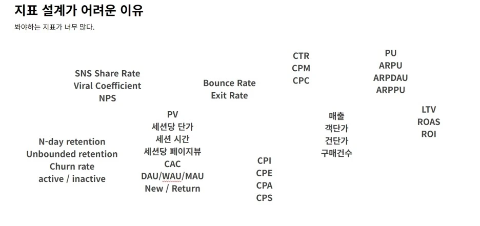 '지표'는 특정 현상을 나타내는 수치입니다. 쉽게 말하면 클릭률(CTR:Click-Through Rate)), 클릭당비용(CPC:Cost Per Click), CPM(노출당비용), CPI(설치당비용), PV(페이지뷰), CAC(가입당비용).. 이런 것들 인데요. 배너 광고 및 검색 광고의 효율을 판단할 때 지표들을 기준으로 성과가 좋다/나쁘다를 이야기할 수 있습니다.