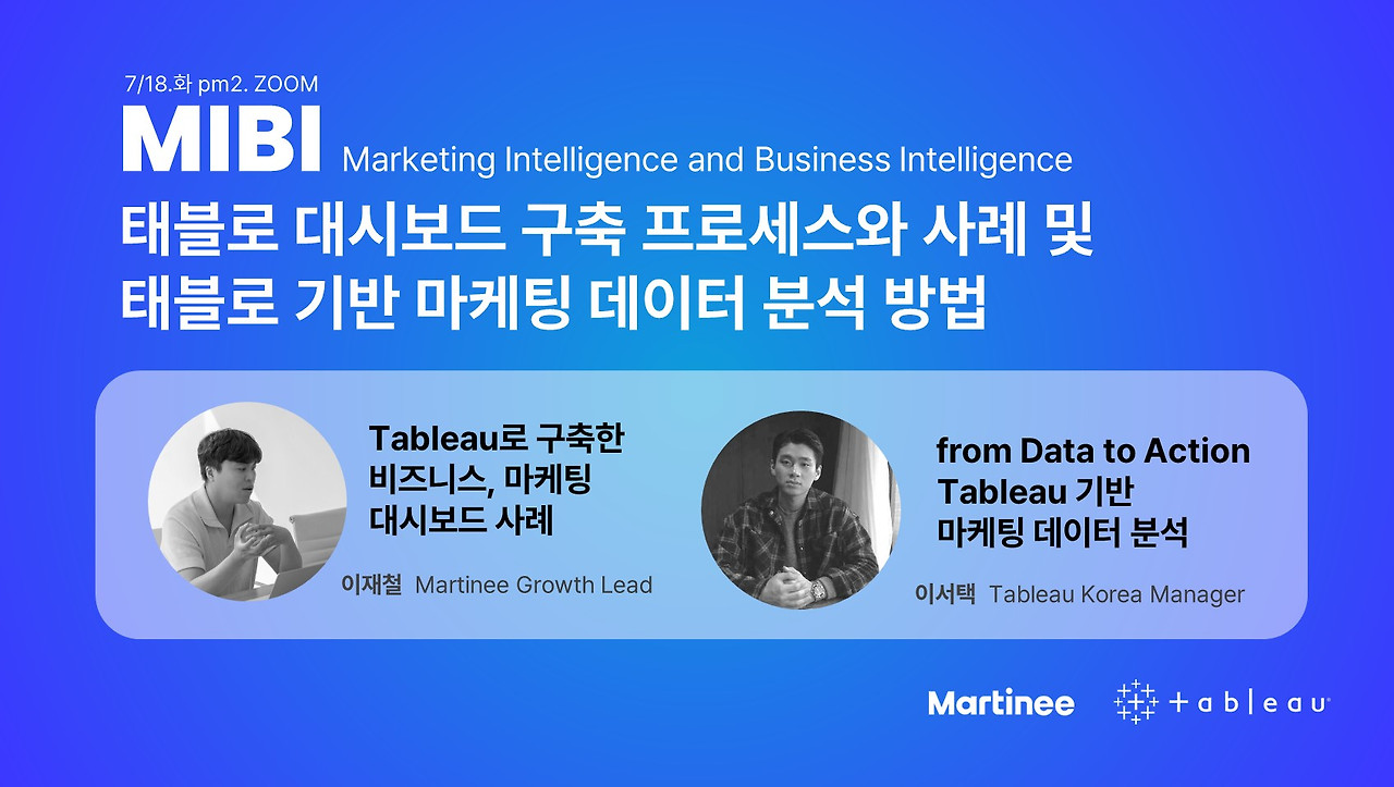 그래서 MIBI 웨비나의 개최가 확정되었다. Marketing Intelligence와 Business Intelligence, MIBI Webinar! 마티니의 그로스 리드 이재철님은 Tableau로 구축한 비즈니스, 마케팅 대시보드 사례를, 태블로의 이서택 매니저님은 Tableau 기반 마케팅 데이터 분석을 주제로 준비해주셨다.