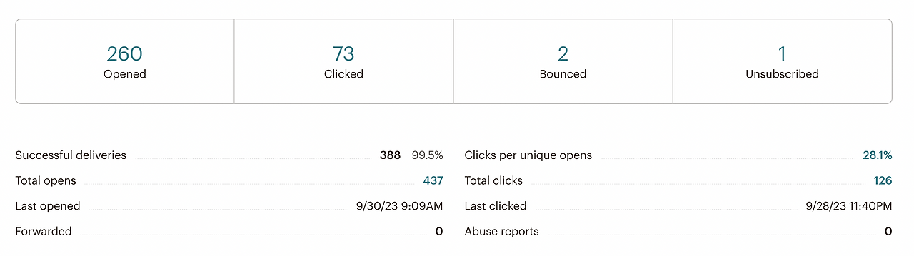이메일 마케팅 툴이 주는 가장 큰 이점은 '메일 수신자의 반응을 측정할 수 있다'는 점입니다. 일반적인 이메일 서비스와 다르게 이메일 마케팅 툴을 활용하면 이메일을 열어보는 것부터, 메일 내 링크를 클릭해 어떤 행동을 하는지까지 쉽게 확인할 수 있습니다. 오픈, 클릭, 구독취소에 대한 숫자, 비율부터 각각의 행동을 한 사람이 누구인지 까지 쉽게 확인이 가능한데, 이 기능은 대부분의 툴은 제공하고 있다고 보아도 무방합니다. 이메일 발송자는 이를 통해 메시지의 효과를 측정해 다음 메일링을 위해 개선해 볼 수 있지요.