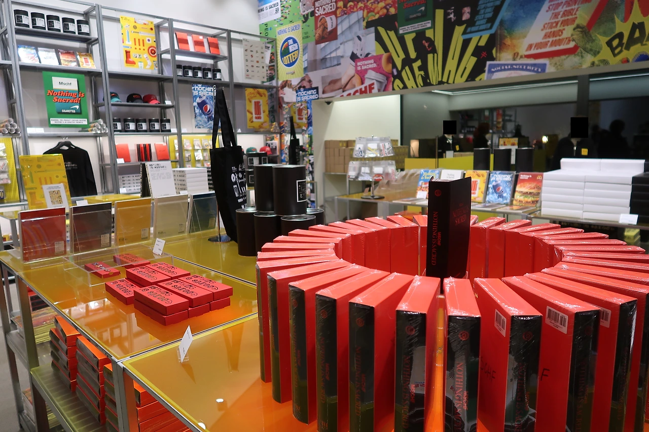 약 두어 시간 동안 미스치프의 독특한 세계를 탐방하고 나서는 당연하게도 일층 굿즈 샵에 도착했다. 생각보다 확 당기는 굿즈는 없었는데, 진 님은 굿즈로 제작된 티셔츠에 꽂혔다.