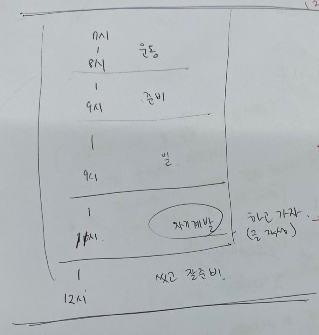 이 목표를 세운 지 일주일 째인데 성공적으로 해낸 건 3일이라 조금 아쉽다. 포기하지 않고 천천히 적응해나갈 예정이다! 아래는 이거 듣고 너무 감동받아서 오자마자 작성한 내 앞으로의 루틴이다.