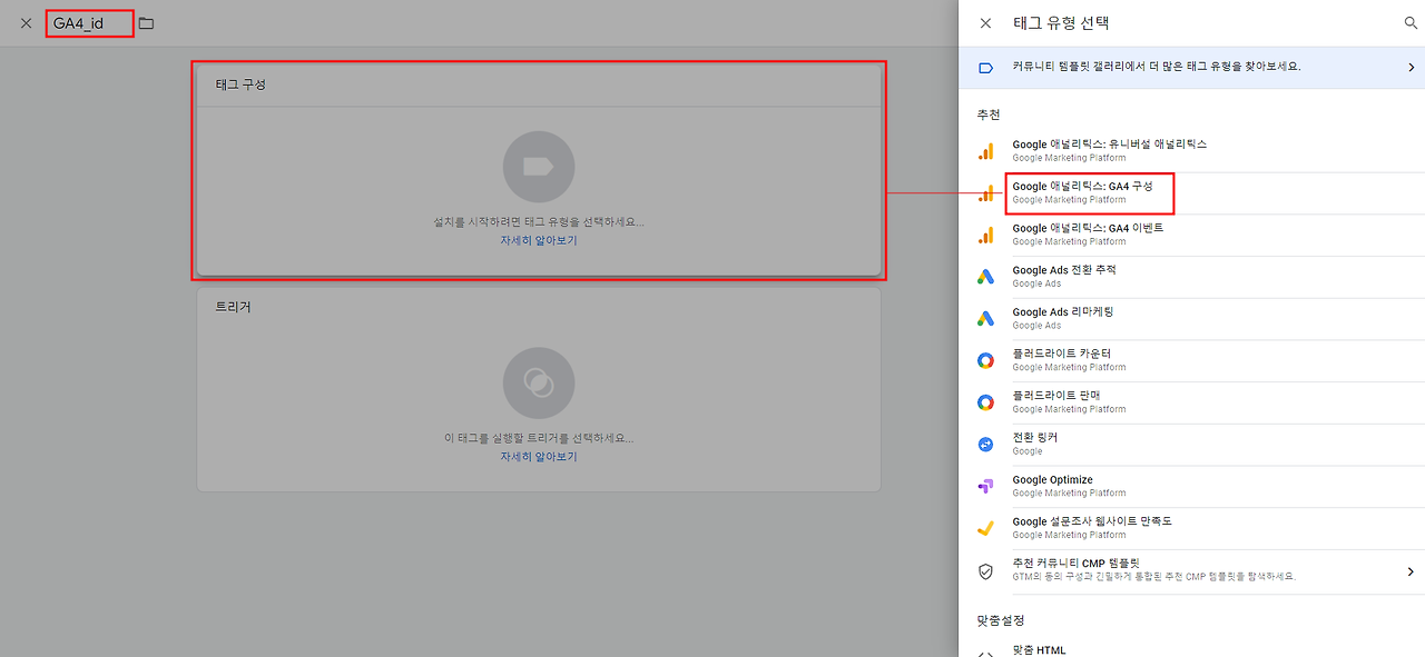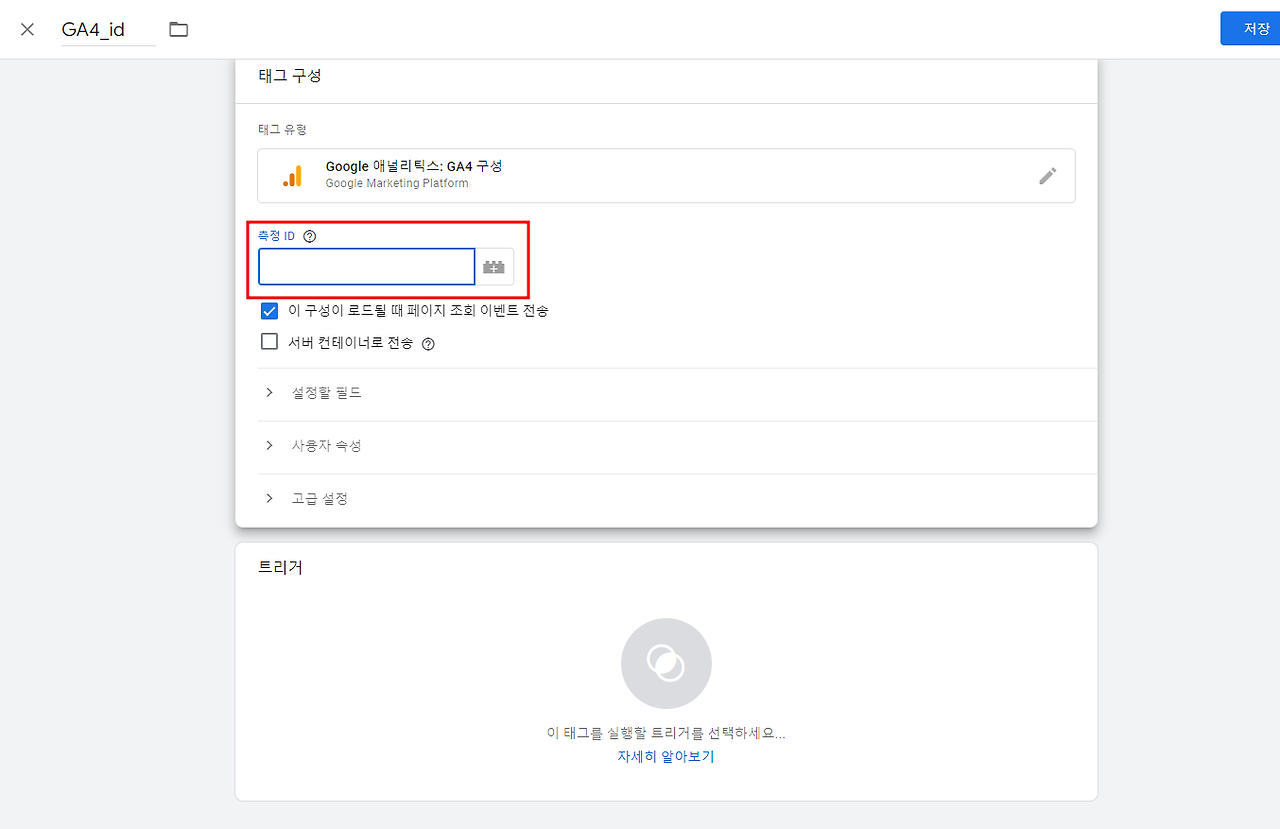 이후 태그 > 새로 만들기로 들어가서 GA4_id 등 구별할 수 있는 이름으로 설정한 뒤, 태그 구성 > "Google 애널리틱스: GA4 구성" > 측정 ID에 GA4에서 복사한 측정 ID를 붙여 넣기 해줍니다.