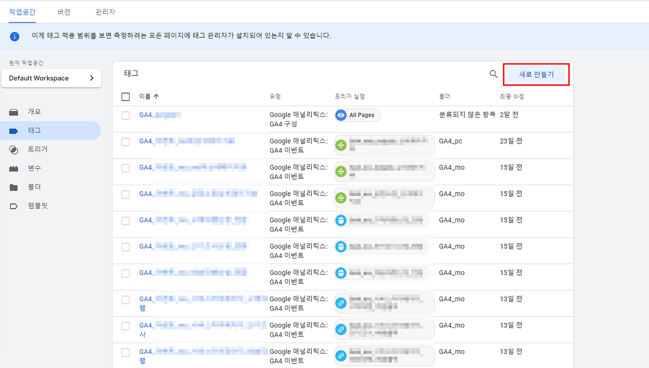 만약 아직 GTM과 GA4 소스 코드 모두 설치하지 않으신 상태이시라면 아래의 GTM을 활용한 GA4 설치 방법을 참고하시면 되겠습니다. 해당 과정은 GTM 소스 코드가 사이트 내에 설치되어 있는 상황에서 진행되었습니다.