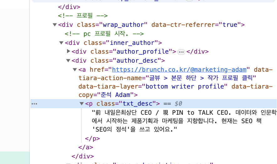 또한 작가 소개란의 페이지 코드를 보시면 작가에 대한 소개가 코딩으로 되어있는 것을 볼 수 있습니다. 구글 서칭봇이 해당 콘텐츠의 작가에 대해 짐작할 수 있을 만한 대목입니다. 서칭 봇은 브런치 글을 색인할 때, 해당 콘텐츠에 대한 작가가 어떤 경력을 가지고 있는지, 전문성이 있는지 판단 내릴 수 있죠.