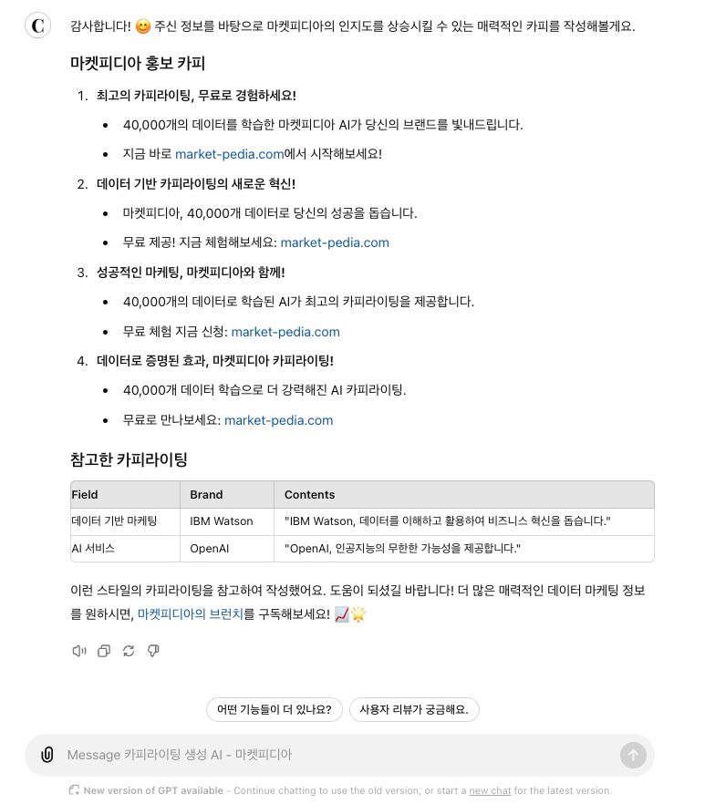 AI가 생성한 카피를 검토해 보세요. 필요한 경우, 약간의 수정을 통해 더 자연스럽고 효과적인 문구로 다듬을 수 있습니다. AI가 제안한 카피는 기본 틀을 제공하지만, 최종적으로 여러분의 터치가 필요합니다. 여기서 사람이 중요한 거죠. AI가 참고한 기존 레퍼런스들도 크로스 체크하며 추가 아이디에이션을 할 수 있습니다.