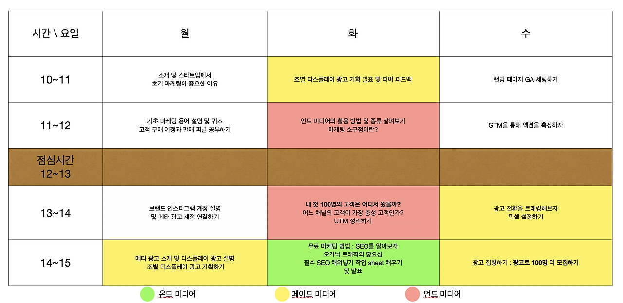 팀별로 각 미디어별 아이디어를 짜고 앞에 나와 발표하며 다른 팀의 피어 피드백을 듣음으로써 미디어 별로 유저들의 경로가 잘 설계되었나 확인할 수 있습니다.