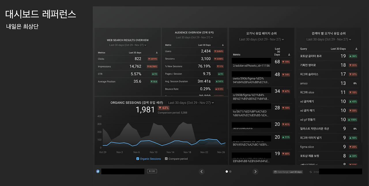 전문성을 살려 사업을 하고 싶어 '마켓피디아'를 프로젝트 팀으로 설립하게 되었습니다. 기업들의 SEO 현황을 분석/진단해 주고, 온페이지/오프페이지 SEO 작업을 통해 자연 유입검색자를 본격적으로 높여주는 일을 하게 된 것입니다. 고객사에게는 아래 사진과 같이 실시간 대시보드도 만들어 주어 작업 후에도 자사 내 역량을 유지할 수 있도록 돕는 일도 하였습니다.