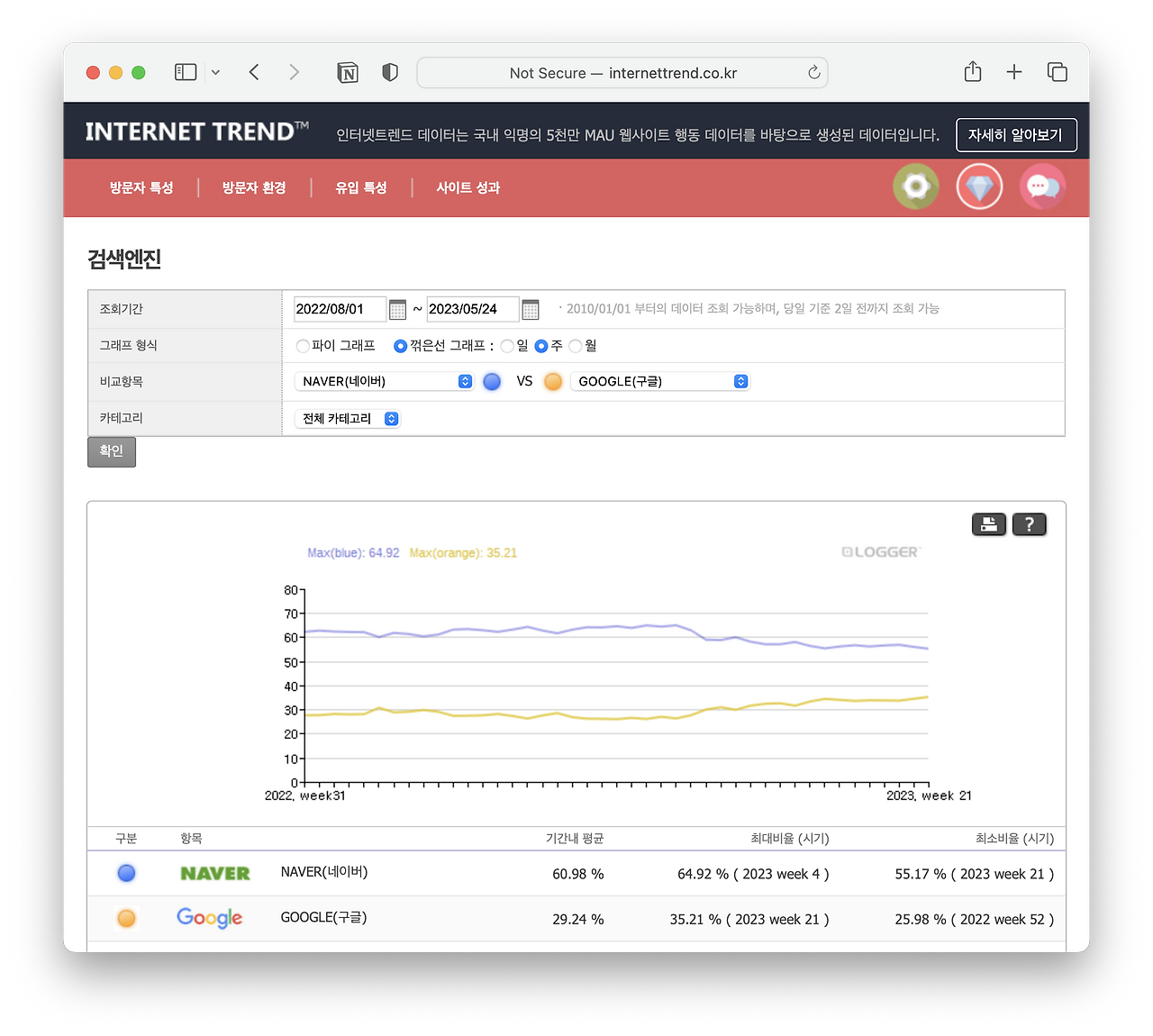 위 사진을 보시면 국내 검색엔진 점유율 추이가 나타나 있습니다. 사실 몇 년 전만 하더라도 10% 밖에 안 되던 구글의 점유율이 어느 사이 30퍼센트 가깝게 올라간 걸 볼 수 있습니다. 사실상 네이버라는 압도적인 국내 플랫폼을 따라잡고 있는 추이라 볼 수 있겠습니다. 하지만 역시 네이버의 점유율이 60%나 되기 때문에 '네이버를 기준으로 공부해야 하는 거 아니야?'라는 생각을 하실 수 있습니다. 그렇지만 역시 구글이 검색엔진계의 1등이기 때문에 네이버의 검색엔진 또한 구글의 것을 닮아 간다는 사실을 인지하셔야 합니다.