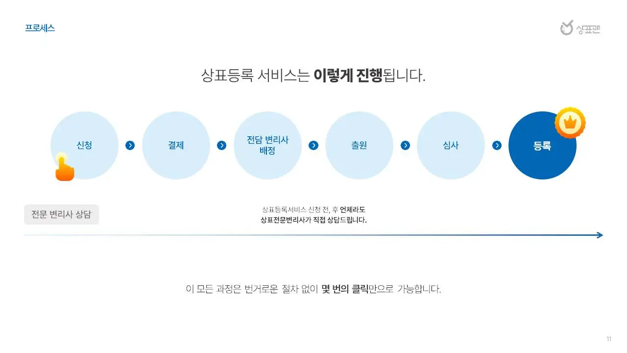 신청 후에는 전담 변리사가 배정되어 유선을 통해 등록가능성에 대한 의견을 제시하고 상표등록까지 발생하는 모든 이슈를 상표맨 시스템을 통해 처리하게 되므로, 상표등록이 처음이라도 매우 편하고 쉽게 신청가능 합니다.
