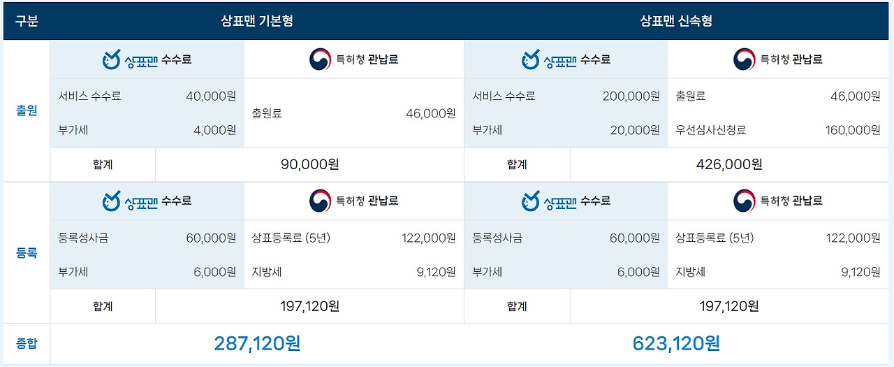 상표맨을 통해 상표 출원부터 등록까지 진행한 경우 소요되는 비용 : 출원시 대리인 수수료(4만원) + 등록수수료(6만원) + 46,000원(출원관납료) + 210,120 원(등록관납료) + 부가세 = 366,120원