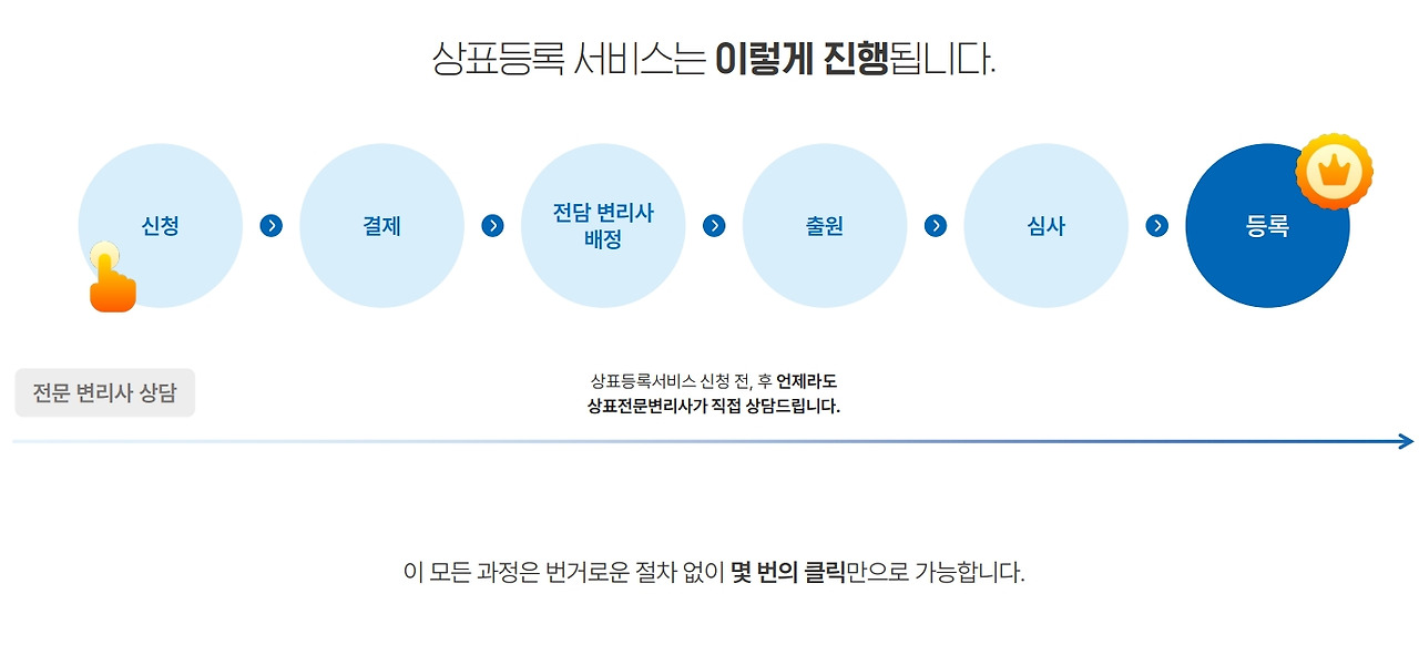 신청 후에는 전담 변리사가 배정되어 유선을 통해 등록가능성에 대한 의견을 제시하고 상표등록까지 발생하는 모든 이슈를 상표맨 시스템을 통해 처리하게 되므로, 상표등록이 처음이라도 매우 쉽고 편하고 신청하실 수 있습니다.