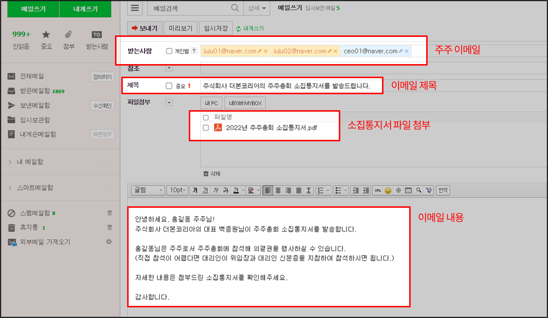 아래 주주총회소집통지서 양식을 작성하셔서, 주식을 가진 모든 주주들의 우편이나 이메일로 발송하세요.